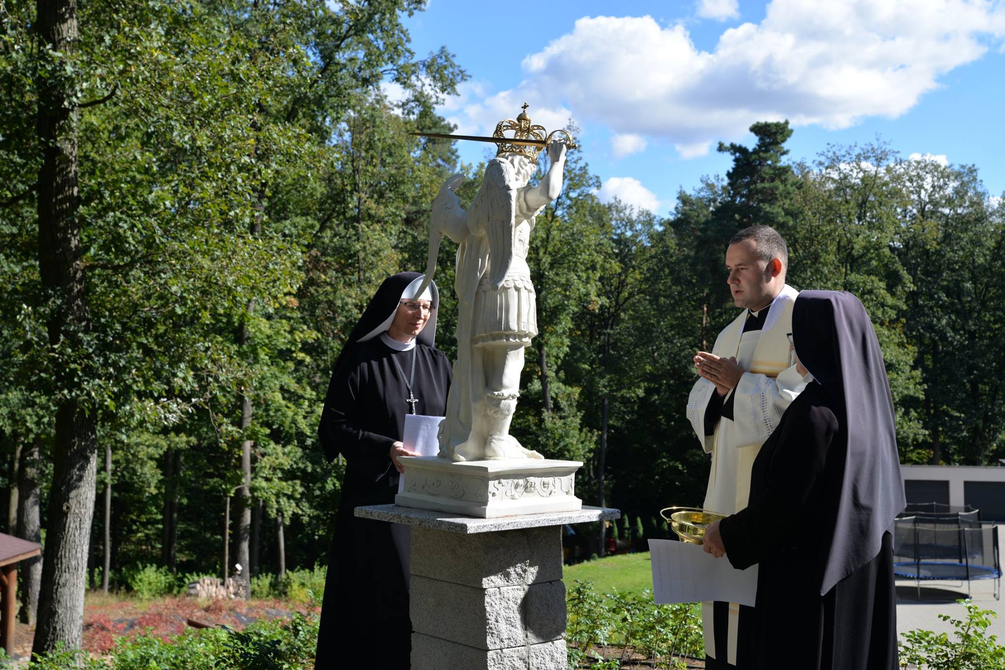 Przy słonecznej pogodzie i w pięknej scenerii Wspólnota Sióstr w Puławach – wraz z wiernymi i kapłanem – wyruszyła w procesji, by dokonać liturgicznego obrzędu poświęcenia figury św. Michała Archanioła, którą zainstalowano na jednym ze wzniesień okalających nasz dom przy ul. Kowalskiego 3. Cieszymy się, że otoczenie nowgo domu tak bardzo pięknieje i mamy nadzieję, że Wspólnota otoczy nas wszystkich – odwiedzających tę stronę i polecających się naszym modlitwom – swoim wstawiennictwem u niezwykłego Orędownika.